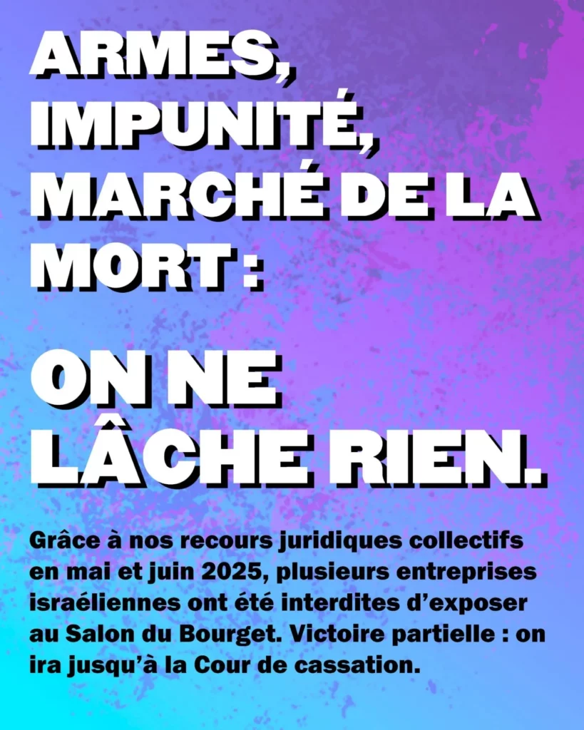 Grâce à nos recours juridiques collectifs en mai et juin 2025, plusieurs entreprises israéliennes ont été interdites d’exposer au Salon du Bourget. Victoire partielle : on ira jusqu’à la Cour de cassation. 🔥 Savoir, c’est pouvoir.Nous publions aujourd’hui nos recherches exclusives:➡️ des entreprises présentes au Bourget livrent encore des armes à Israël;➡️ certaines contournent les