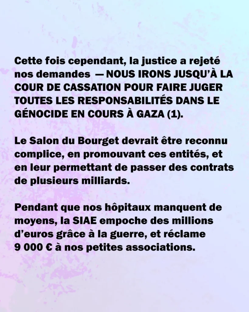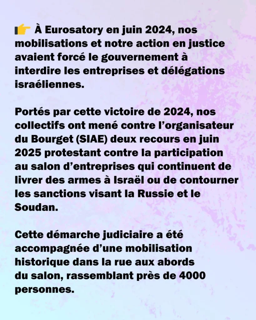 Grâce à nos recours juridiques collectifs en mai et juin 2025, plusieurs entreprises israéliennes ont été interdites d’exposer au Salon du Bourget. Victoire partielle : on ira jusqu’à la Cour de cassation.