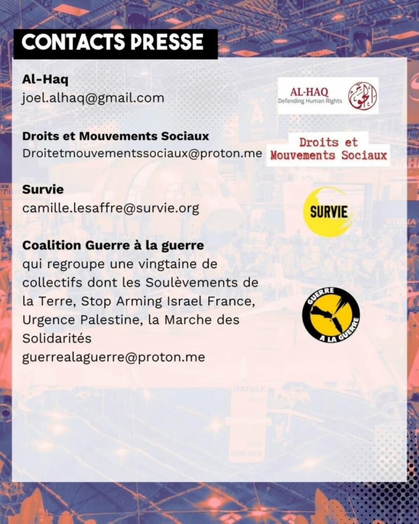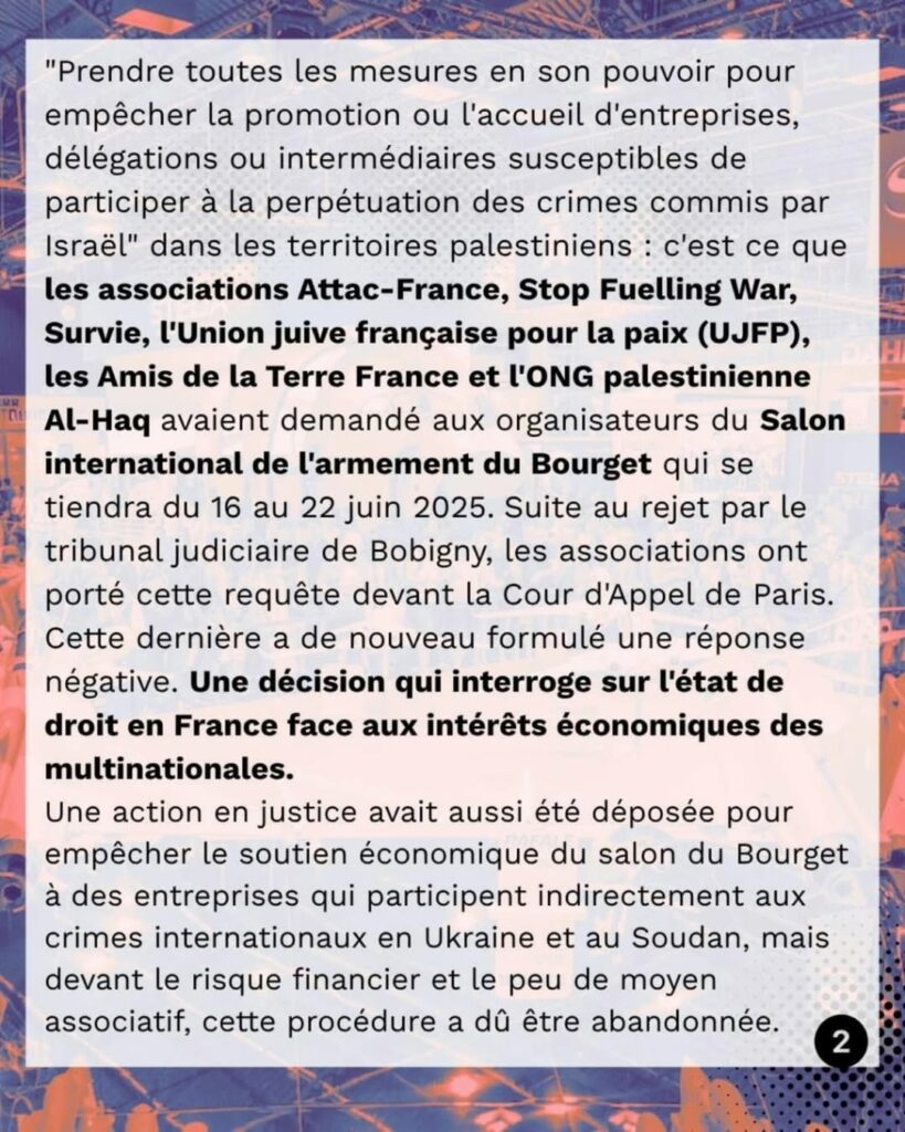 💥 Tout n’est pas perdu ! La justice française permet au Salon du Bourget d’offrir une vitrine aux entreprises qui participent au génocide et nous condamne à lui payer 9000 euros.
