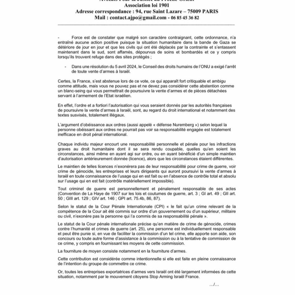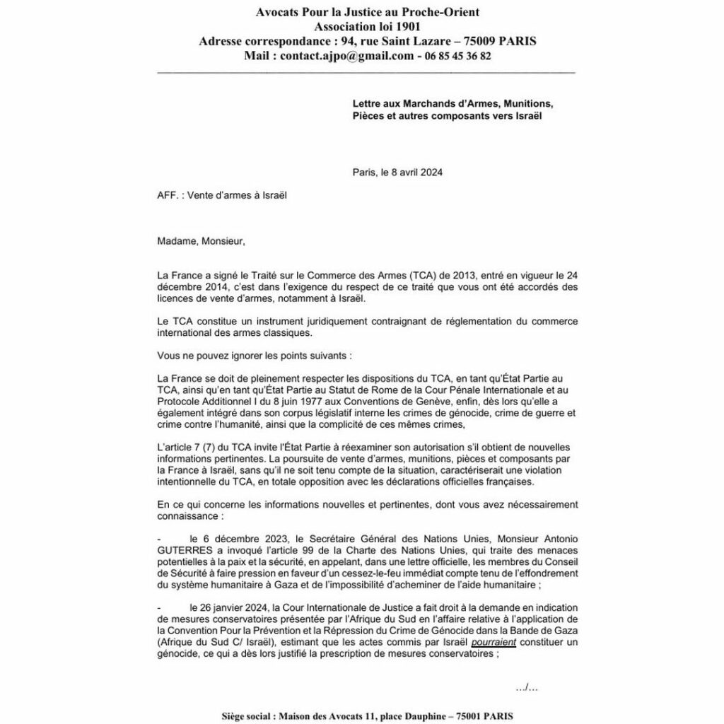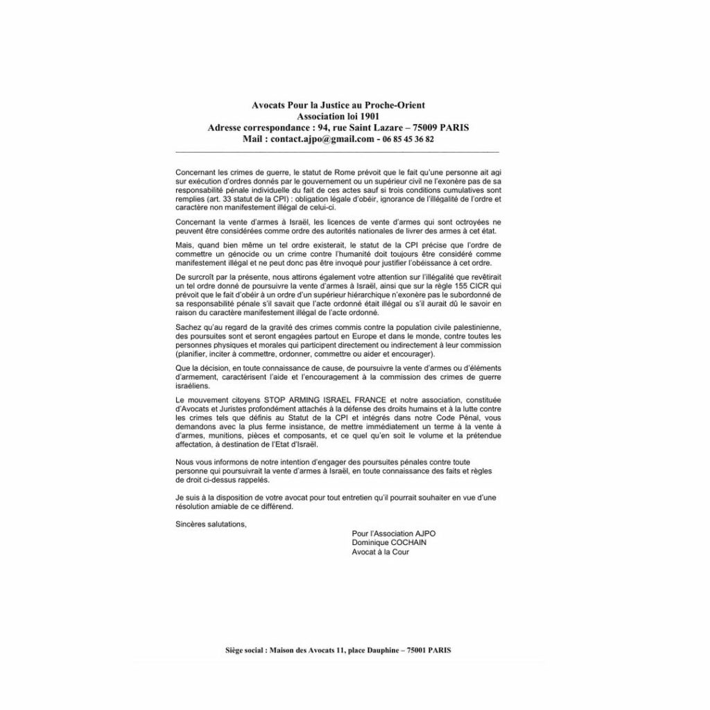 Les AVOCATS POUR LA JUSTICE AU PROCHE ORIENT et STOP ARMING ISRAEL ont adressé le présent courrier à une vingtaine d’entreprises impliquées dans la vente d’armes à ISRAEL afin de les mettre en garde sur les conséquences pénales de la poursuite cette activité. Nous complétons cette communication par la présente lettre ouverte.