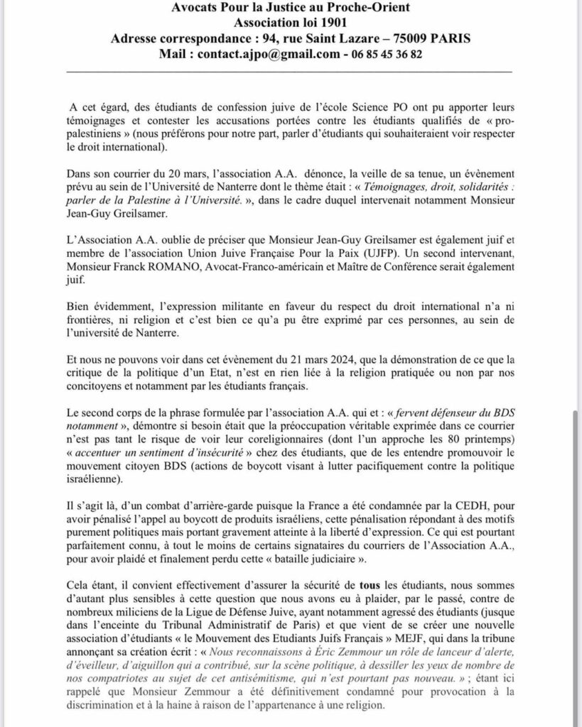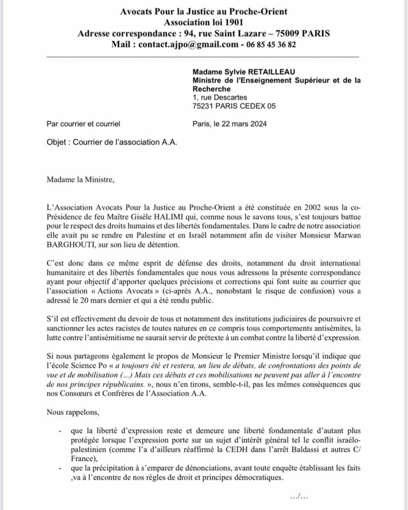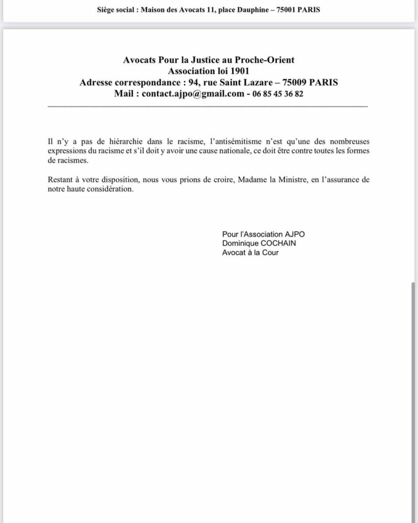 En réponse au courrier de nos confrères de l’association Action avocats ( AA), l’association Avocats pour la justice au proche orient a aussi interpellé la ministre actuelle.