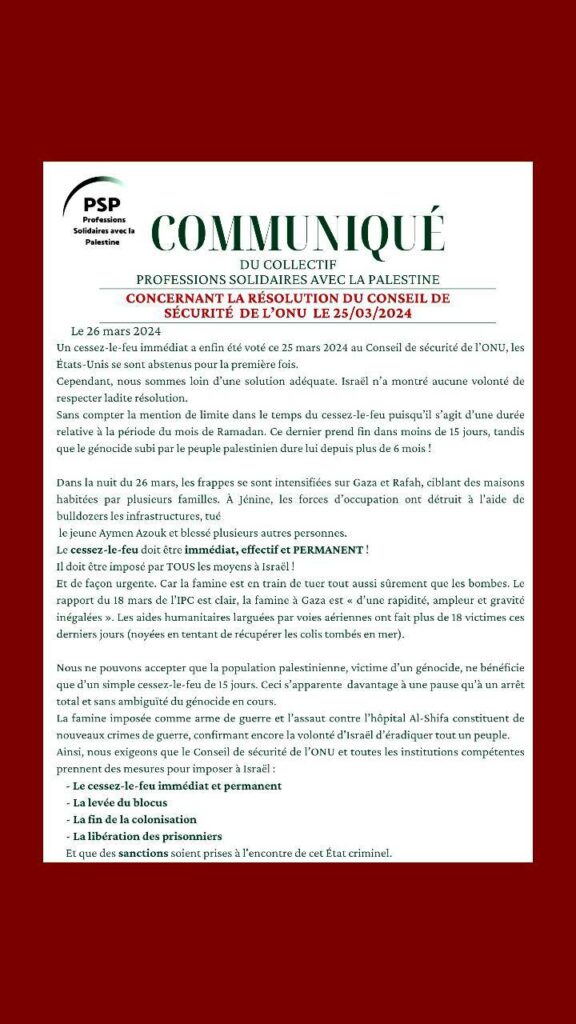 Communiqué du Collectif Professions Solidaires avec la Palestine concernant la résolution du Conseil de Sécurité de l’ONU le 25/03/2024.