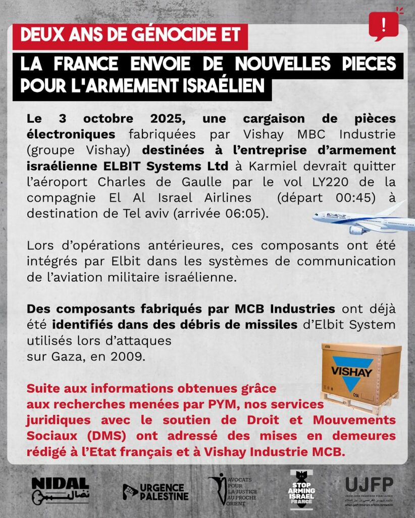 ✈️ Le 3 octobre 2025, une cargaison de pièces électroniques fabriquées par Vishay MBC Industrie (groupe Vishay) destinées à l’entreprise d’armement israélienne ELBIT Systems Ltd à Karmiel devrait quitter l’aéroport Charles de Gaulle par le vol LY220 de la compagnie El Al Israel Airlines (départ 00:45) à destination de Tel aviv (arrivée 06:05)
