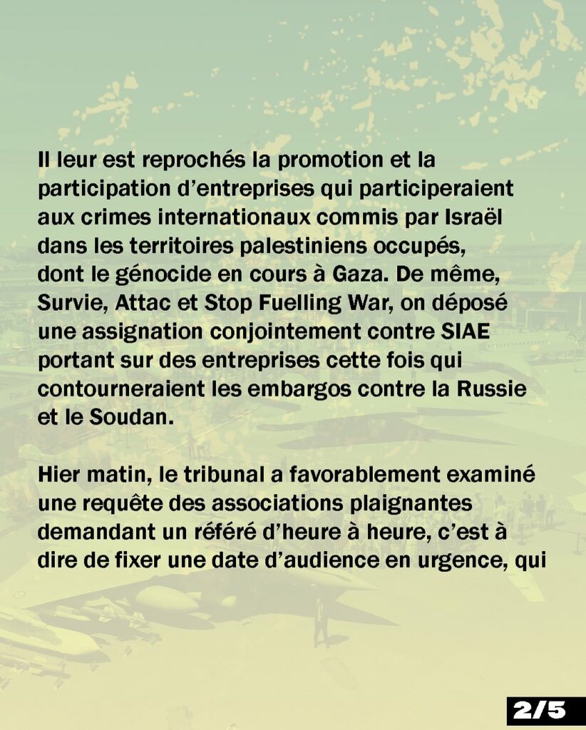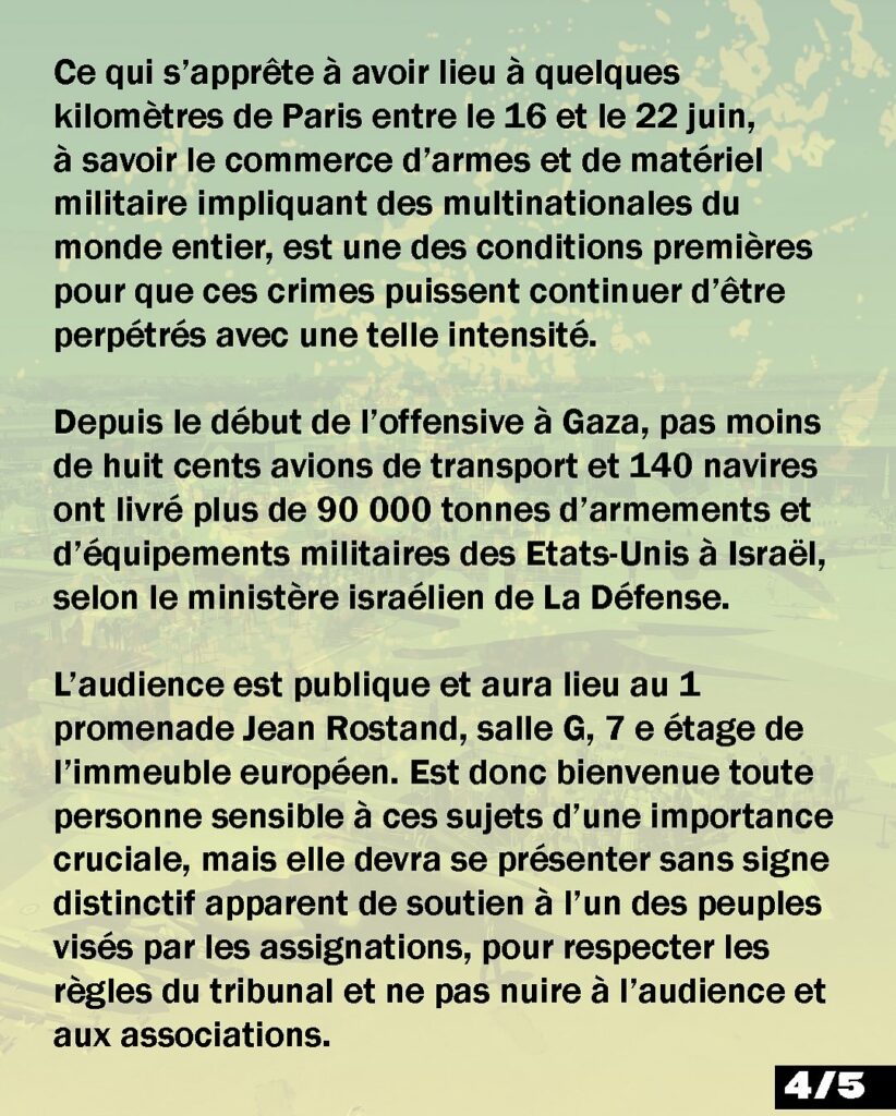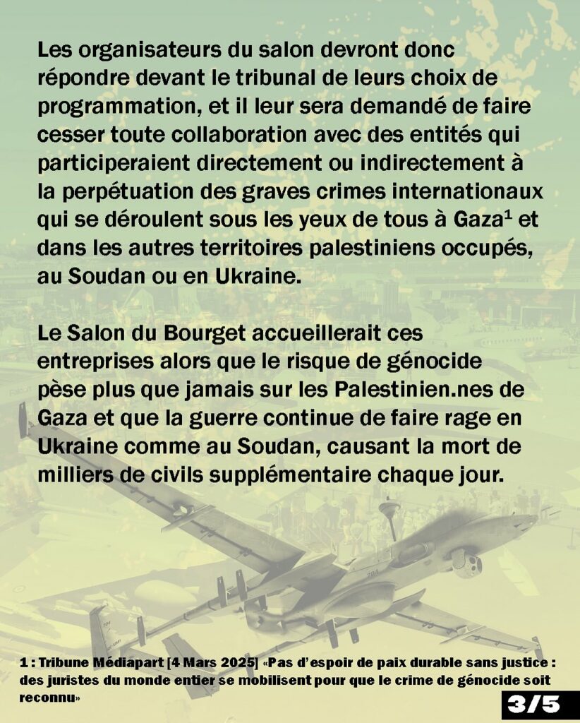 Soutenez l’action judiciaire qui demande à l’organisateur du salon de l’armement de cesser toute collaboration avec des entreprises ou délégations qui participeraient à la perpétuation des crimes les plus graves à Gaza et autres territoires palestiniens occupés, au Soudan et en Ukraine :