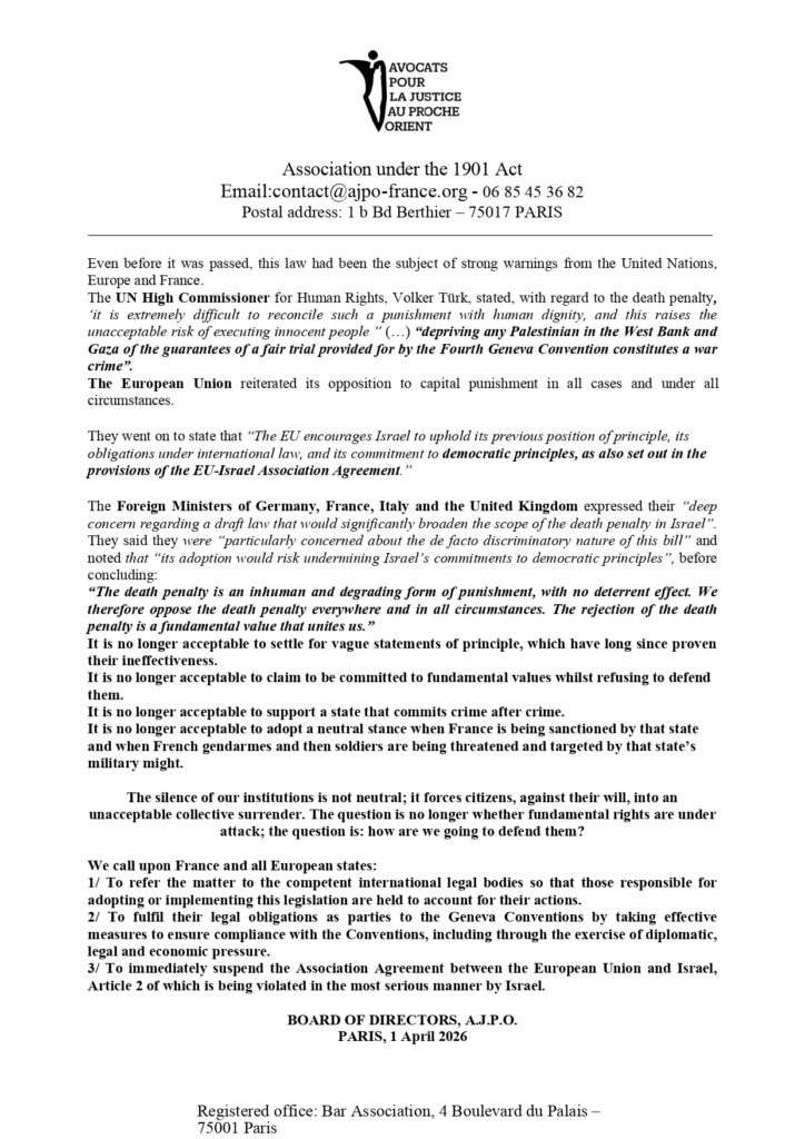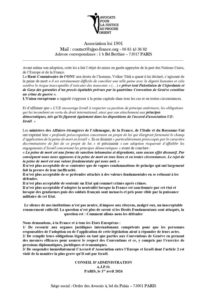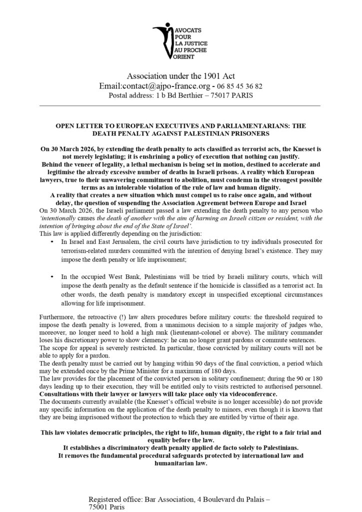 Open letter to European executives and parliamentarians: the death penalty for Palestinian prisoners